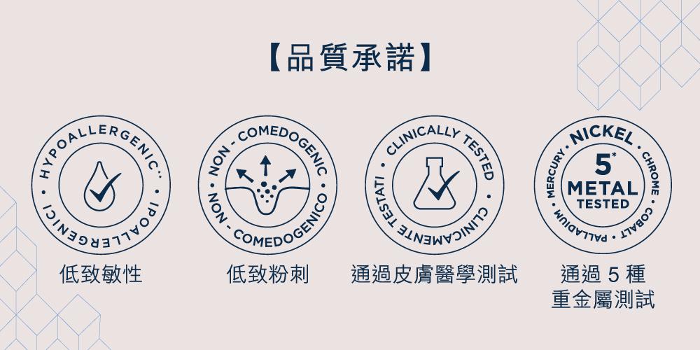 - 低致敏性 / 低致粉刺 / 通過皮膚醫學測試 / 通過重金屬 ( 鎳、鈷、鉻、鈀、水銀) 測試。